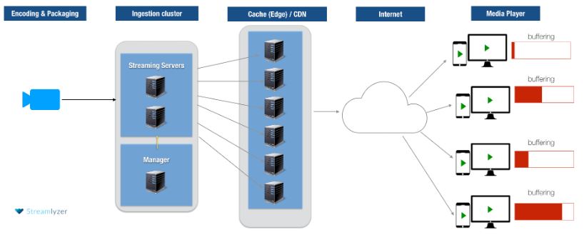 - Ingestion server - 통상 산업계에서 CDN에서 직접 접속하기전에 Wowza, Red5 pro같은 스트리밍서버를 중간 설치하여 녹화, 알람, 불법 콘텐츠 모니터링등에 이용한다. 이 단계에서 캐쉬를 너무 크게 잡거나 latency 조정을 잘못할 경우 지연시간이 길어 질 수 밖에 없다.
