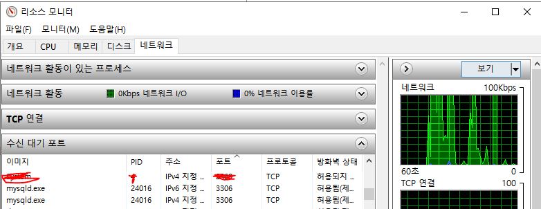 리소스 모니터 창에서 해당 포트(3306)을 사용하는 PID를 찾는다.