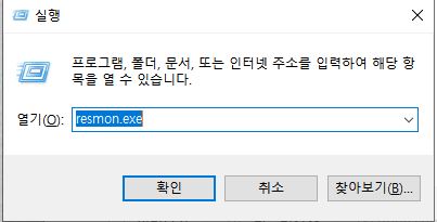 Win+R을 눌러 resmon.exe 입력 후, 확인