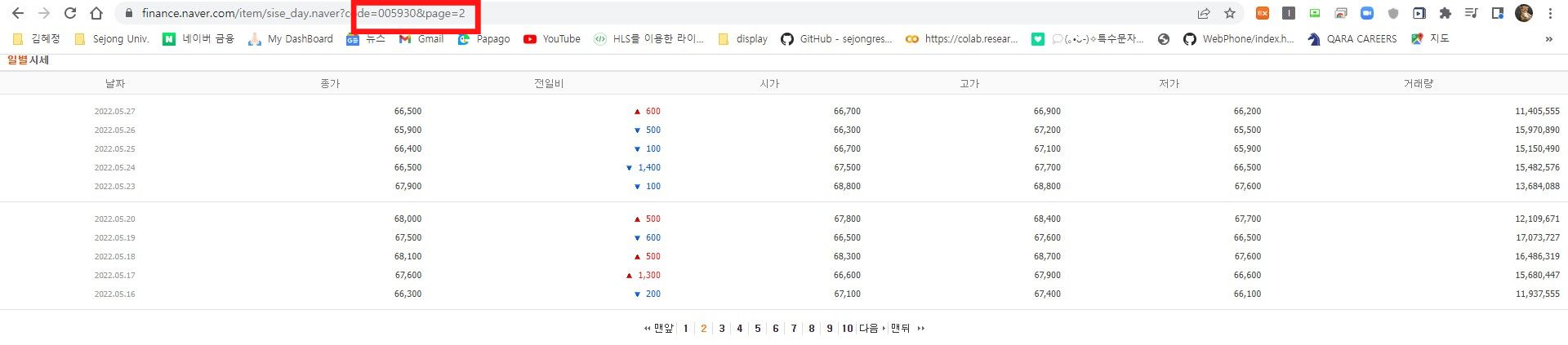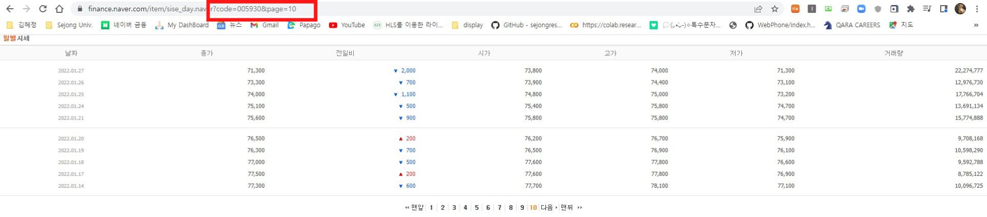 저는 네이버 금융의 삼성전자 일별 시세 url을 선택하였습니다.