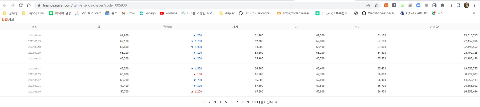 저는 네이버 금융의 삼성전자 일별 시세 url을 선택하였습니다.