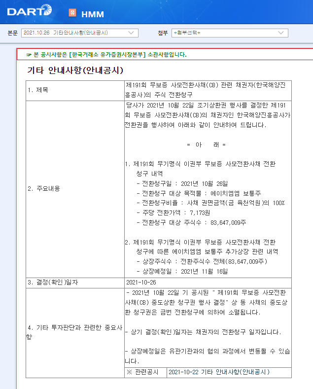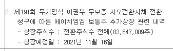 실제로 제 191회 채권자는 2021년 10월 26일에 주식을 전환해달라고 요청했어요.