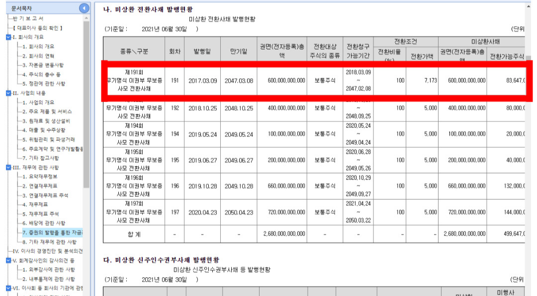 - 전환가능 주식 수 : 채권자가 주식으로 바꿀 수 있는 개수 => 83,647,009개