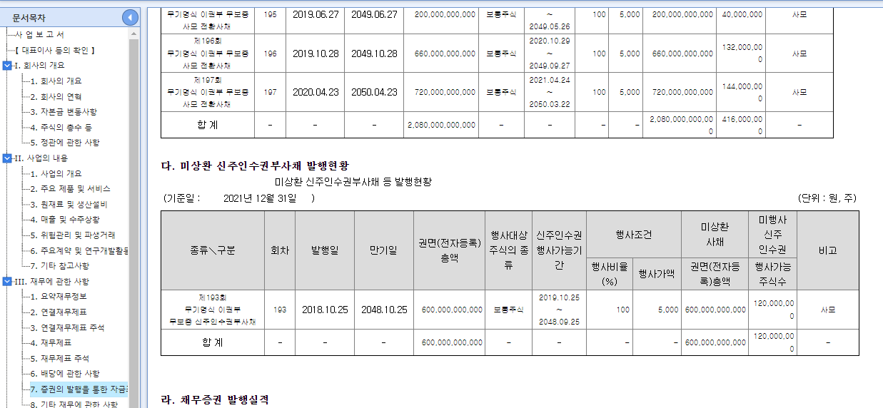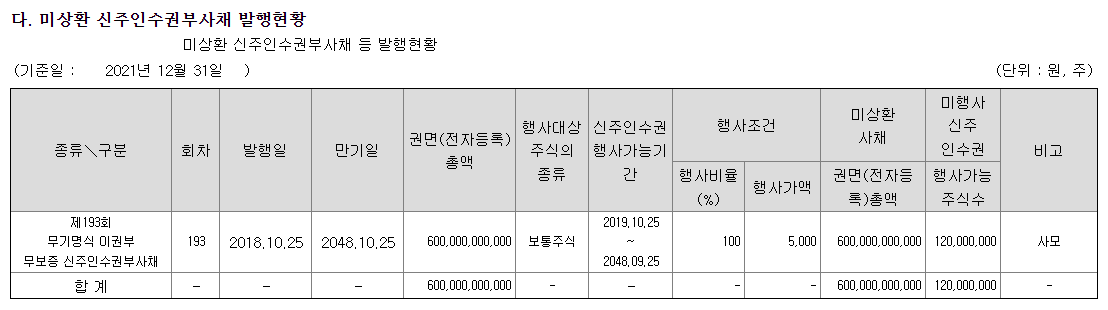 - 미상환 신주인수권부사채 : 아직 갚지 않은 신주인수권부사채